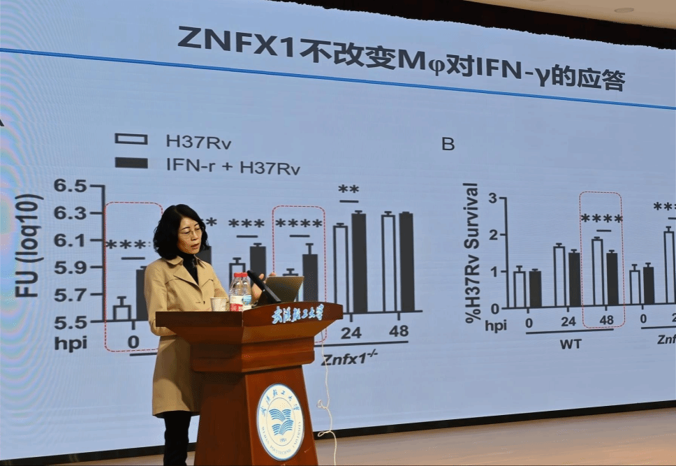 报告聚焦揭示ZNFX1抗结核感染的分子“密码”。作为当前单因致死率最高的慢性传染病,结核病的防控始终是全球公共卫生领域的重点难题,而马骊教授团队长期深耕结核感染免疫研究,本次报告正是围绕结核分枝杆菌(Mtb)与宿主免疫的互作机制展开深入解析。在新靶点发现方面,研究明确,保守锌指蛋白家族成员ZNFX1会在Mtb感染巨噬细胞后出现显著的表达上调,它能借助自身的锌指区结合并稳定Prkaa2 mRNA,以此维持细胞的自噬通量,进而实现对Mtb增殖的有效抑制;在功能验证环节,实验结果显示,敲除Znfx1的巨噬细胞免疫应答能力会明显受损,Mtb载量随之大幅增加,而被感染的小鼠也会同步出现肺脏损伤与脾脏慢性炎症的症状;从临床意义来看,这一研究成果不仅拓展了RNA结合蛋白调控结核感染免疫的认知边界,更为结核病易感性检测提供了全新的候选靶点。