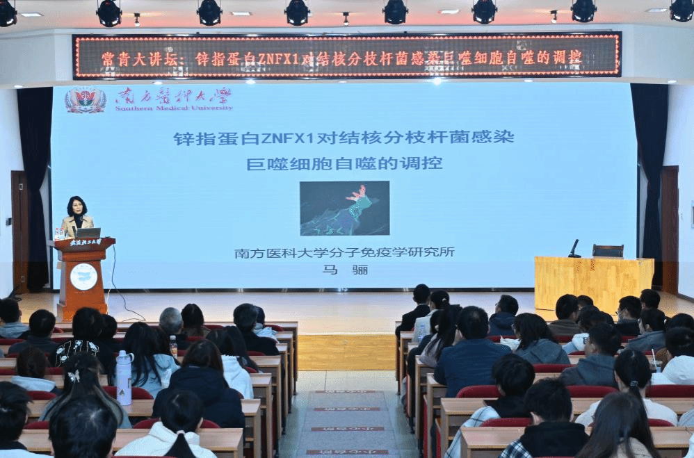 2025年12月5日下午,南方医科大学党委副书记、校长马骊教授在科学报告厅作题为《锌指蛋白ZNFX1对结核分枝杆菌感染巨噬细胞自噬的调控》的学术报告,聚焦结核病免疫机制的前沿突破,吸引了众多科研人员与师生参与。