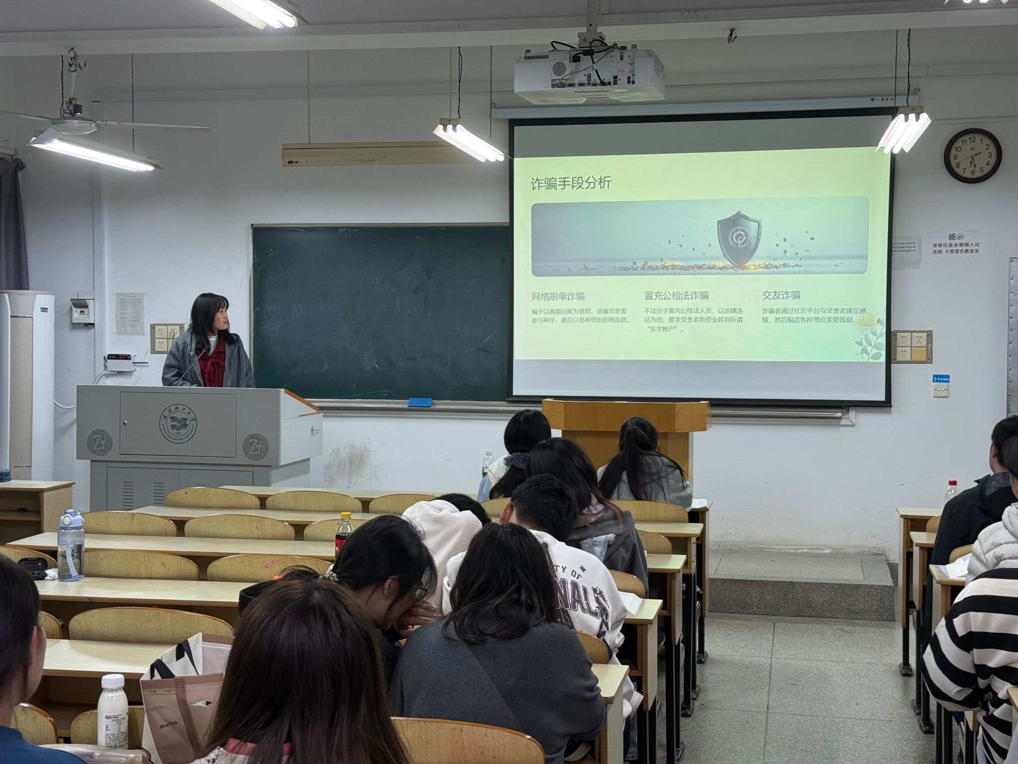 电诈反诱骗是本次班会的重点内容。辅导员结合当前高发的电信网络诈骗案例,系统梳理了针对大学生的刷单返利、冒充客服退款、虚假征信注销、网络交友诱导转账、校园贷等常见诈骗手段。通过拆解诈骗分子的话术套路,总结出“不轻信、不透露、不转账”的反诈核心原则,提醒新生警惕任何要求提供个人信息、银行卡密码及验证码的行为。同时,现场指导新生下载安装“国家反诈中心”APP,讲解其预警防护功能,并鼓励新生向家人朋友普及反诈知识,共同构筑反诈防线。